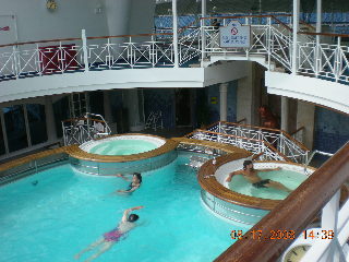 The first night we had dinner in the dining room, but soon discovered that we preferred the flexibility and casualness of the buffet line on the 14th floor, so that was where we had the rest of our meals. Teddie ordered room-service breakfast a couple of times and seemed to enjoy that a lot. But other than exploring the boat, there wasn't much to do but browse around the shops and eat. For two days I felt like I was trapped in the food court at the mall.