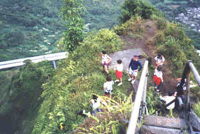 This is about halfway up the ladder. The road in the background is the new H-3 highway, and the houses are part of Kaneohe. We're just beginning to get into the clouds, as you can see on the left.