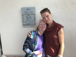 Teddie and Zoe pose in front of the plaque the